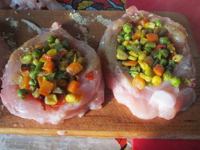 Куриную грудку я разрезала на четыре порции. Остальные кусочки филе более мелкие использовала для приготовления обычных шницелей.Филе грудки -700г, Замороженная овощная смесь -300г, Сыр – 100г, сметана -2стл, соль, перец,