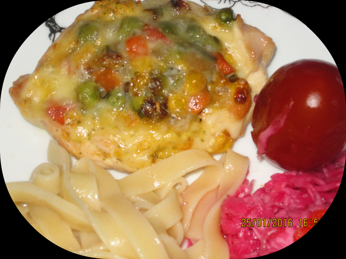 Филе грудки -700г, Замороженная овощная смесь -300г, Сыр – 100г, сметана -2стл, соль, перец,
