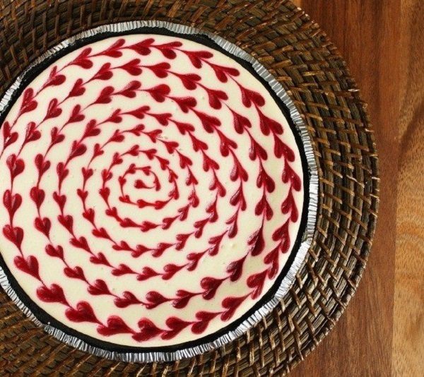 Этот чизкейк покорит сердца всех сладкоежек без исключения, ведь он объединил сразу 3 лакомства: сладкий белый шоколад, нежный сливочный сыр и ароматный малиновый джем, при помощи которого и сделан «сердечный» узор!