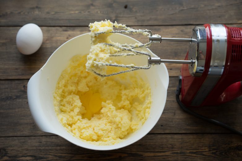 1. В чаше соедините сахар (225 гр.) и масло (225 гр.), хорошо взбейте миксером. Не стоит напоминать, что только комнатной температуры масло даст вам нужный эффект смешивания.