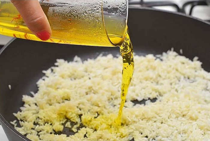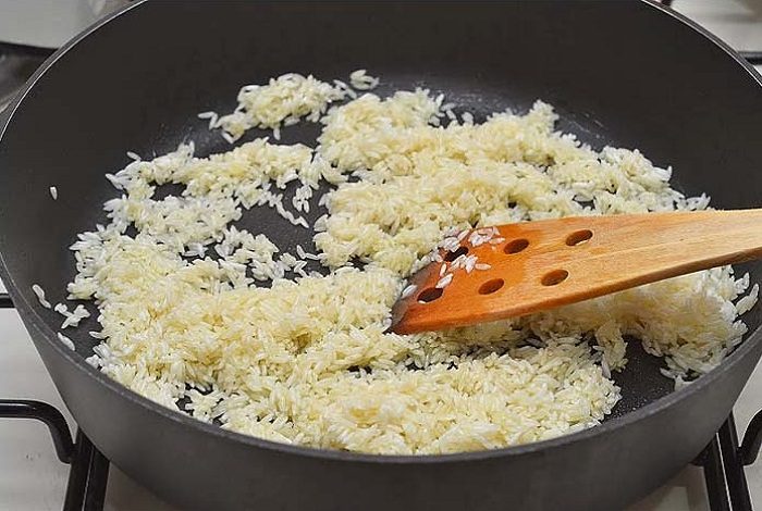 5. Теперь наше масло стало очень ароматное, добавляем туда рис и очень быстро перемешиваем, чтоб рис впитал масло. Буквально 30 секунд.