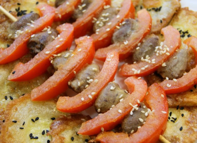 Супер ужин! Только вот не совсем понял как нанизывать дольки помидора. На фото они сверху шпажки.