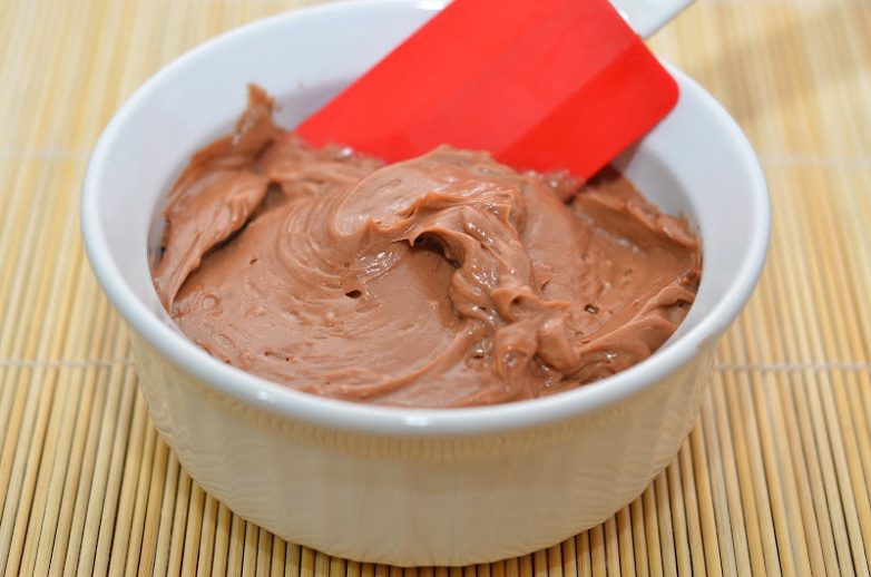 4. Разводим какао в воде, добавляем туда же ванильную эссенцию и вмешиваем в крем. Хорошенько взбиваем всё вместе.