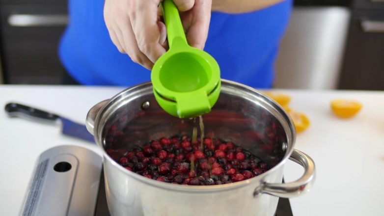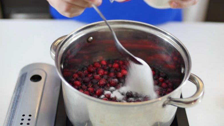 Теперь приступаем к соусу. Закидываем клюкву в кастрюлю и присыпаем сахаром по вкусу.