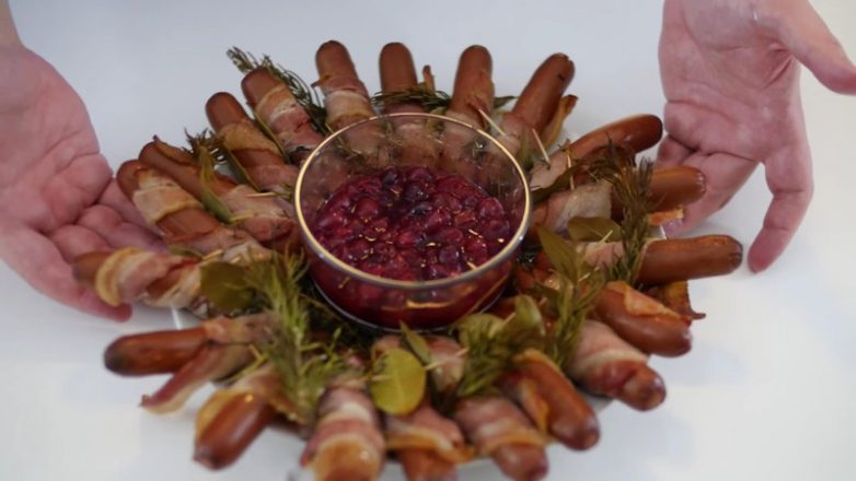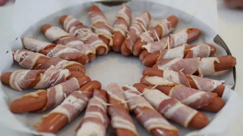 Оборачиваем все сосиски в бекон и укладываем на тарелку. Закрепляем зубочистками.