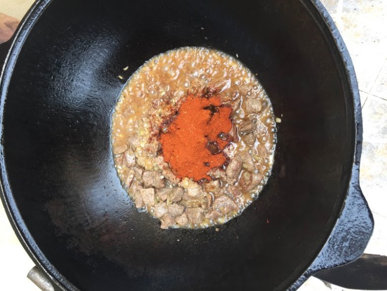 в раскаленное масло опускаем порезанную кубиками говядину. Активно перемешиваем. Нужна легкая корочка, но не пережарить)))