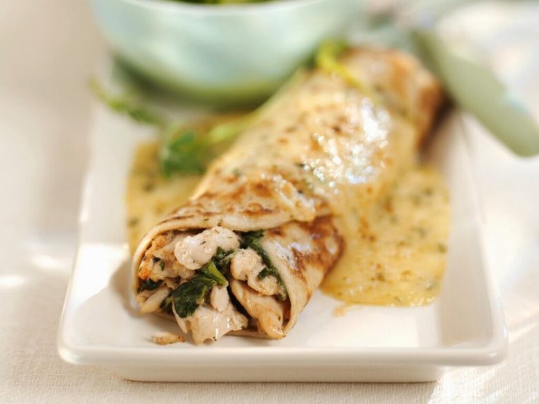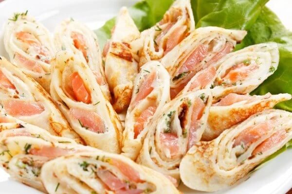 Филе рыбы нужно заранее отварить в течение 5 минут. Помытые и мелко нарезанные шампиньоны положить на сковородку с разогретым сливочным маслом и жарить грибы около 5 минут. В соус добавить укроп и хорошенько перемешать. Выложить в центр блинов сначала чайную ложку соуса, а на него немного начинки, которую можно поперчить по вкусу. Затем «упакованные» блины нужно поставить в духовку, поливая их сверху остатками соуса. После нескольких минут ароматное блюдо готово.