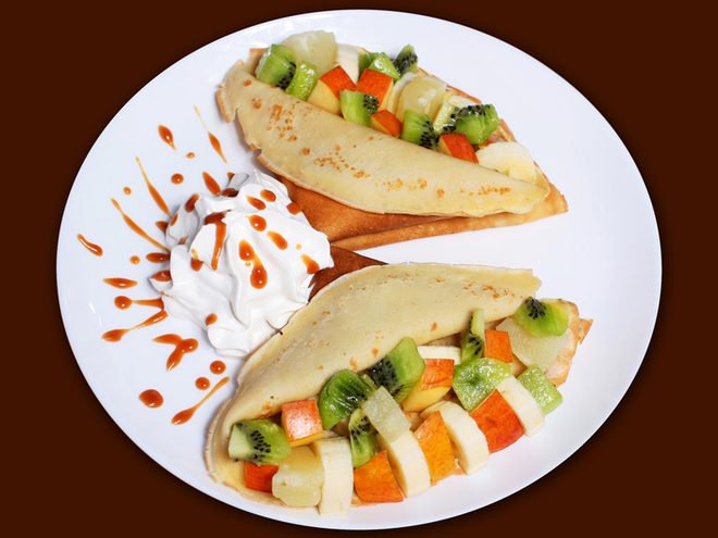 На край блина выкладываем много однородной и плотной начинки (творожный крем, взбитые сливки, суфле). Затем аккуратно сворачиваем блин по кругу, как будто делаем кулек из бумаги.