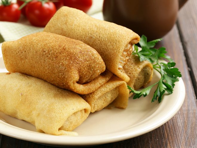 Все просто: выкладываем начинку по краю блина и сворачиваем его трубочкой.