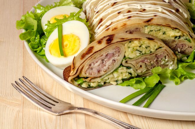 © Еще один способ эффектно нафаршировать блины – сложить их вчетверо, аккуратно отогнуть верхний край и заполнить начинкой.