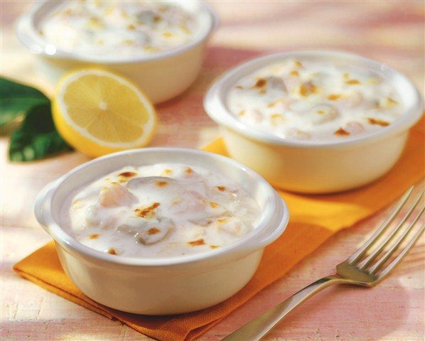3. Небольшие формочки обмажьте изнутри маслом, наполните грибами и кусочками рыбы. Полейте соусом, запекайте 25–30 минут при t 180 °С. Подавайте с багетом.