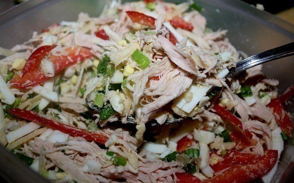 Индюшку отвариваем, остужаем и рвем руками на волокна, перчик режем тонкой соломкой, режем лук и яйца, сыр трем на тёрке, все смешиваем, заправляем
