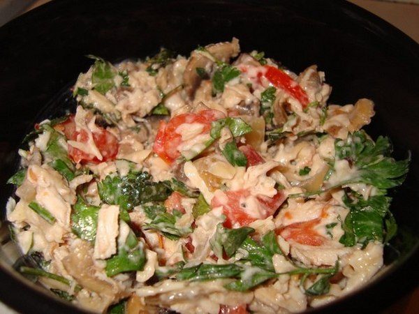 Затем заправляем салат приготовленным соусом и еще раз перемешиваем!