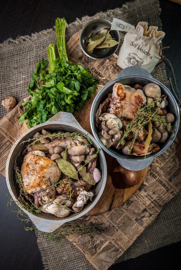 — Собрать все вместе. В казанок сложить слоями мясо, картошку, луковички, все грибы, тимьян, лавровый лист. Все равномерно солить и присыпать перцем.