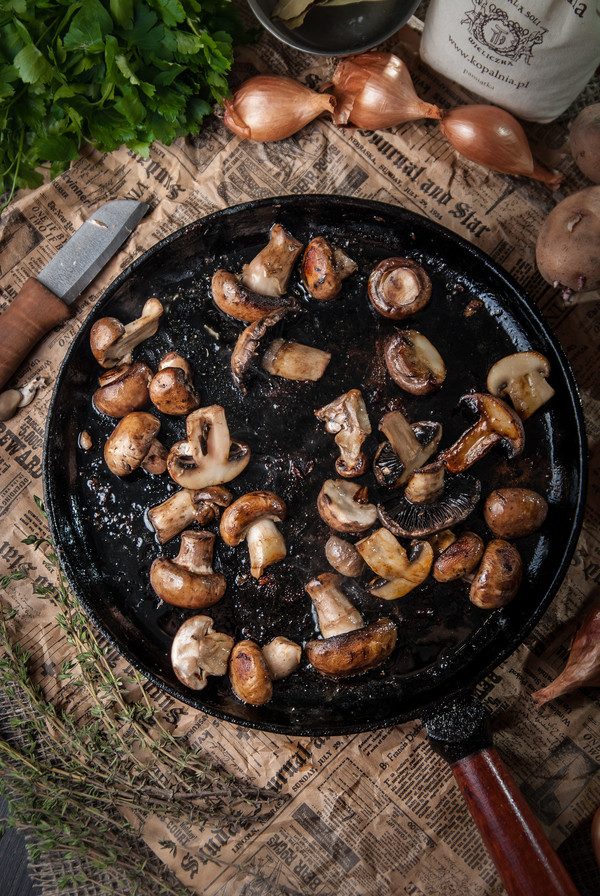 — В оставшемся масле слегка обжарить нарезанные шампиньоны. Вешенку оставить свежей.