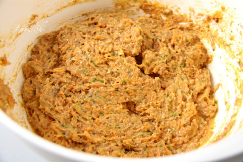 Все ингредиенты, кроме муки и разрыхлителя измельчите в блендере.