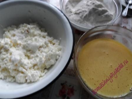 Яйца взбить с сахаром, туда же всыпать и ванильный сахар. Творог, если нормальной влажности можно просто размять, если суховатый перетереть через сито. К творогу добавить соду и соль, перемешать.