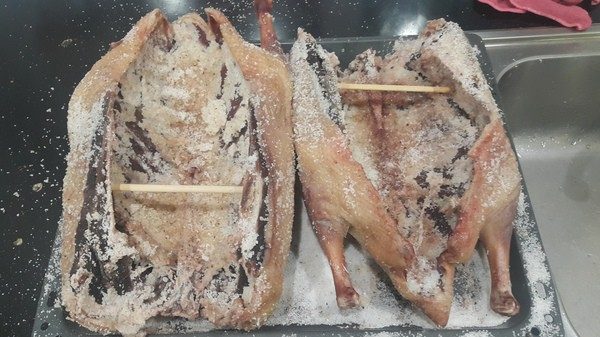 за день с гуся набирается столько жидкости. это мясной сок вперемежку с жиром. не экономьте соль и выкидывайте ее, иначе гусь будет пахнуть старым жиром.