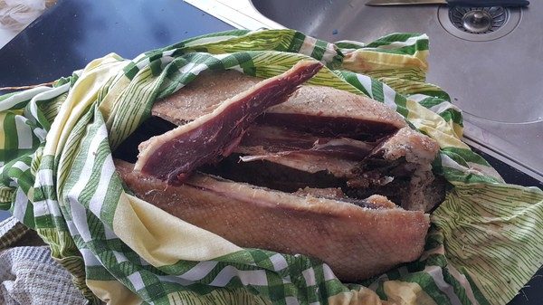 От автора: «Это блюдо я готовлю в ноябре-декабре. время, когда в деревнях режут свежих откормленных гусей, а впереди маячит новогоднее обжиралово. по вкусу напоминает хамон, но готовится намного проще и в домашних условиях.»