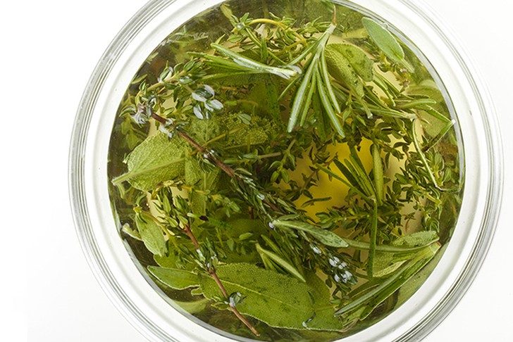 1. Смешайте оливковое и подсолнечное масло. Добавьте сок лимона, крупномолотый перец, веточки зелени.