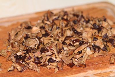 Достаем грибы и промываем под проточной водой. Нарезаем грибы соломкой. Воду из под грибов процеживаем через 3 слоя марли.