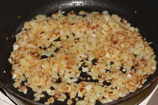 В сковородке где жарились грибы обжариваем лук до золотистого цвета.