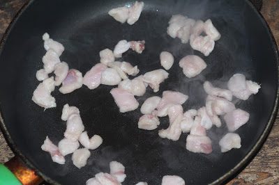 Утиные грудки порезать на небольшие кусочки и обжарить до золотистого цвета.