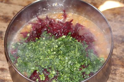 В кастрюльку к сваренным картошке и морковке добавить свеклу с луком и аджикой, укроп, петрушку, грибы, капусту и оставшуюся воду. Все хорошо перемешать и довести до кипения.