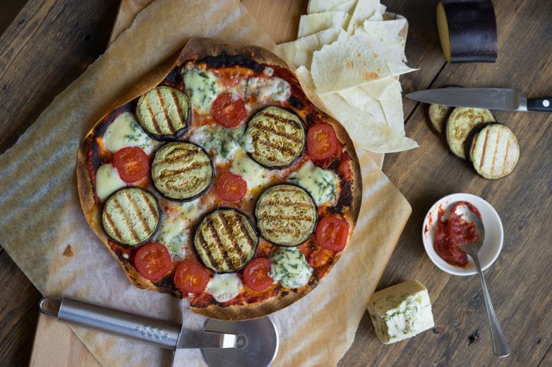 7. Пока баклажаны обжариваются, готовим основу. На лепешку наносим томатный соус. Здесь снова правило утилизации: что осталось, то и кладите. Это может быть томатная паста, кетчуп, песто, овощная икра, остатки рагу и так далее. Сверху трем сыр, моцарелла, чеддер, грюер подходят отлично, если их нет — трите всё, что есть. Чем твёрже сыр, тем лучше. Несколько долек помидора. Можно добавить ломтики перца, грибочков. И баклажаны.