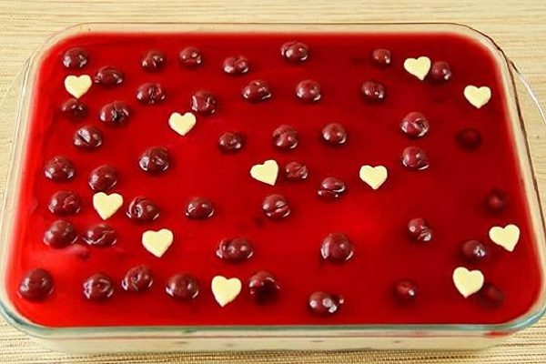 17. Итак, у нас получается 2 вида желе. Желе из пачки льем первым слоем и раскладываем в него оставшуюся вишню.
