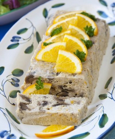 Готовый паштет вынуть из формы, охладить при комнатной температуре, украсить и подать к столу с листьями салата, зеленью петрушки и кусочками апельсина.