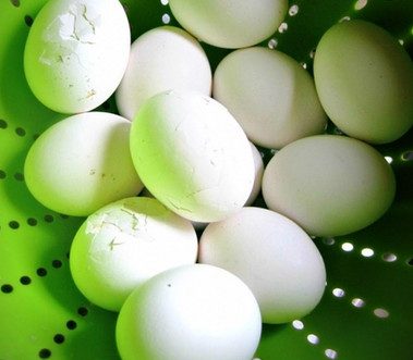 Разрезаем яйца на половинки, желток смешиваем с каким-нибудь наполнителем. Это может быть, что угодно: мелко резаный зелёный лук, мелкие кусочки селёдки, пропущенные через сито, майонез, паштет — тщательно смешиваем вилкой компоненты, начиняем половинки яиц — еда готова!