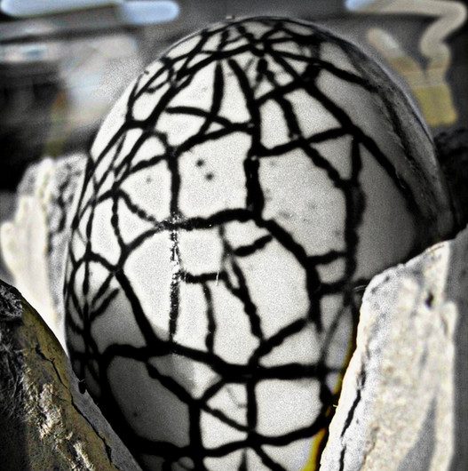 Яйца варим вкрутую, слегка остужаем, чтобы рукам не было горячо. И аккуратненько разбиваем ложечкой так, как наметили, чтобы получилась мозаика. Потом кладём яйца в целлофановые пакеты с разными (приготовленными так, как написано в инструкции) красителями, ждём необходимое время. Вынимаем из пакетов, убираем скорлупу, яйца под ней красиво и съедобно окрасились.