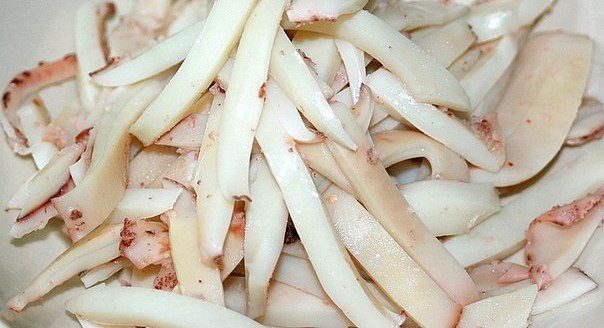 Кальмаров разморозить, очистить от внутренностей. Положить в кипящую подсоленную воду буквально минуты на 2-3, — до тех пор, пока они не побелеют и шкурка не свернется!