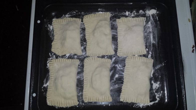 На противень влазит 6-8 пирожков, я делаю по 6, так как из пачки теста всего получится 12. Как раз две партии.