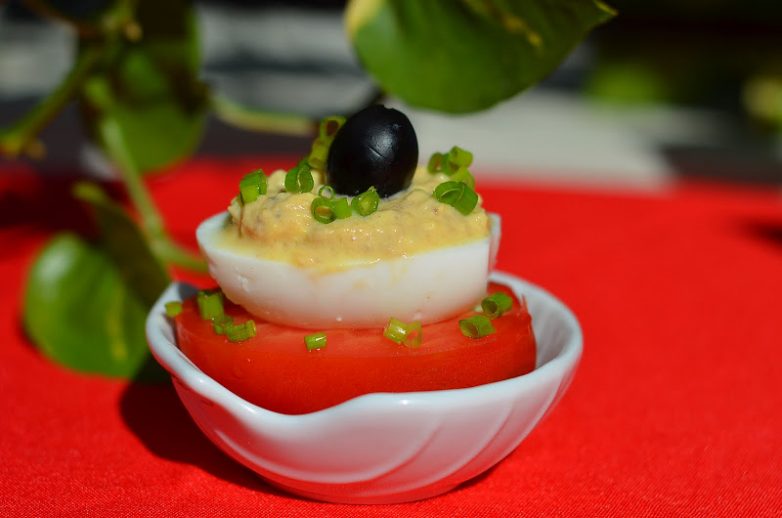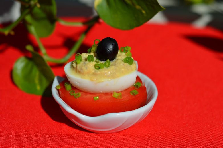 3. Разрезаем помидоры пополам, вынимаем серединку. Выкладываем готовые желтки в белки. Ставим яйцо в помидор, сверху украшаем оливкой и зелёным луком. Чтобы помидор стоял устойчиво, острым ножом срезаем низ помидорки.