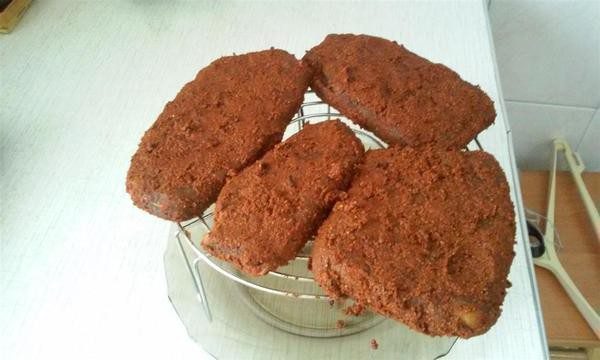 Теперь, когда трое суток прошло, мы достаем мясо и обмазываем его специями. Все специи смешиваем вместе, наливаем немного кипятка и намазываем равномерно на наше мясо.