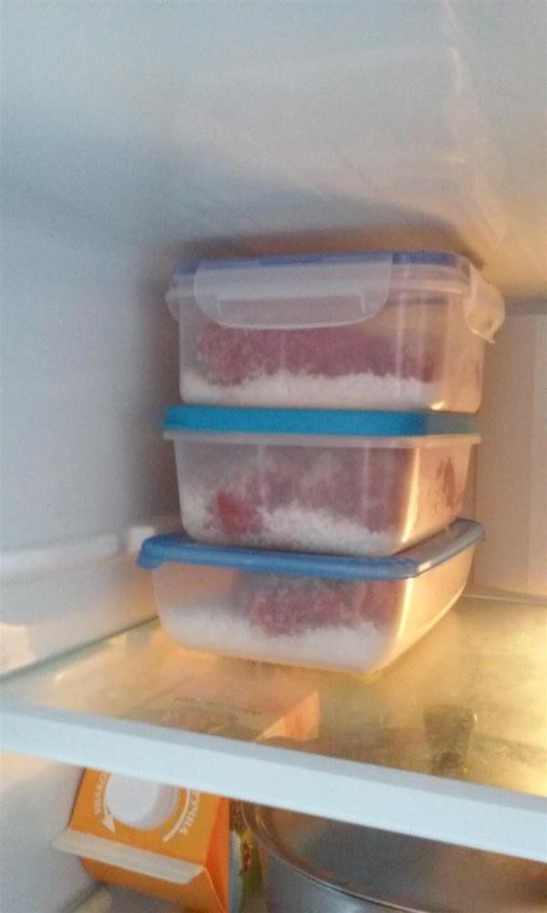 Дальше мясо засаливаем. Я взяла пластиковые контейнеры, насыпала в каждый соли и обмазала солью мясо, после чего контейнеры закрываем и убираем в холодильник на трое суток. Каждый день нужно сливать жидкость и переворачивать мясо на обратную сторону.