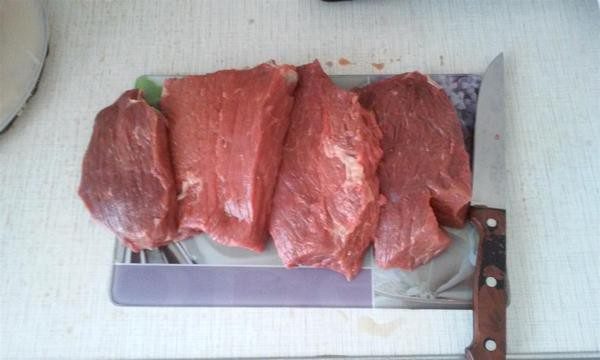 Сперва берем кусок мяса, моем его и режем на приблизительно одинаковые куски.