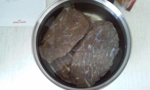 По прошествии трёх суток достаем мясо и промываем его под проточной водой. Теперь нам нужно его вымочить. Складываем все в кастрюлю, набираем внутрь воду и оставляем на 3 часа (каждые полчаса воду нужно менять).