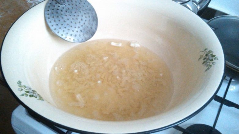 Когда резинки подрумянились. Достаем в дуршлаг половником, давая стечь маслу.