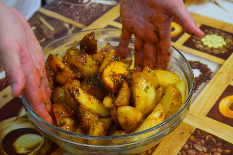 Отваренные дольника картофеля заправляем приготовленной обмазкой