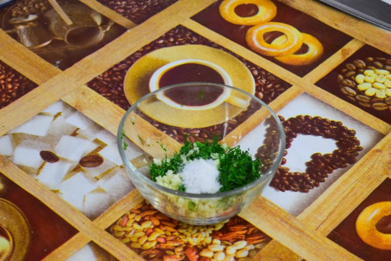 В укроп с чесноком добавляем сольну где то 1 чайную ложку