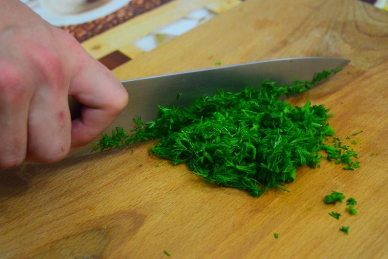 Для заправки мелко нарезаем укроп