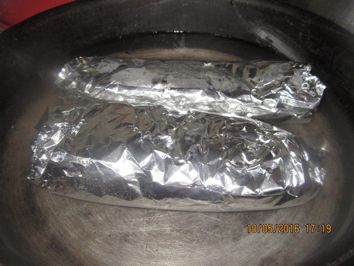Выкладываем полученную массу в два (вложить их друг в друга) полиэтиленовых пакета, сформировать колбасу и завязать завязками (или нитками). Я весь фарш разделила 2 колбаски и разложила в фольгу.