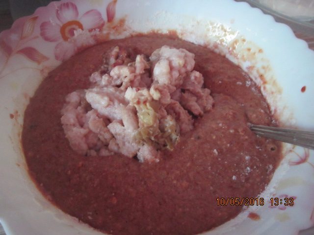 Перекрутить на мясорубке, печень, лук и чеснок.Добавить яйца, муку или манку, соль и перец. Хорошенько перемешать.