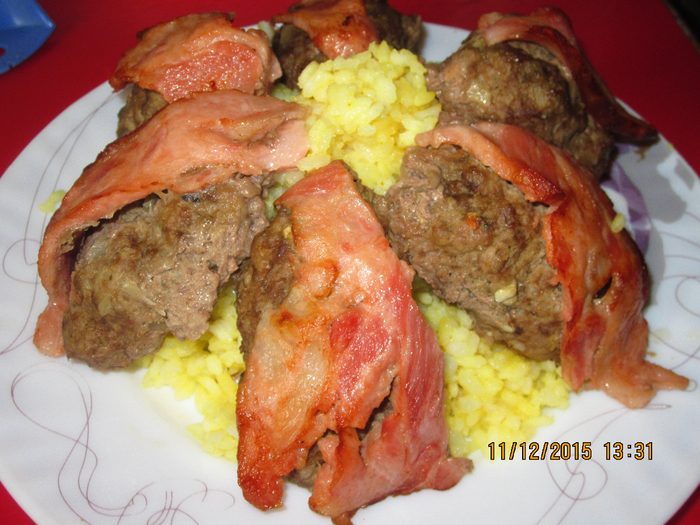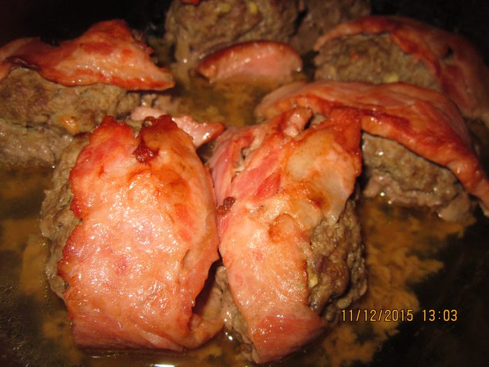Каждую обернуть тонкой полоской шпика и уложить в жаропрочную форму.У меня не было шпика, и я нарезала грудинку.