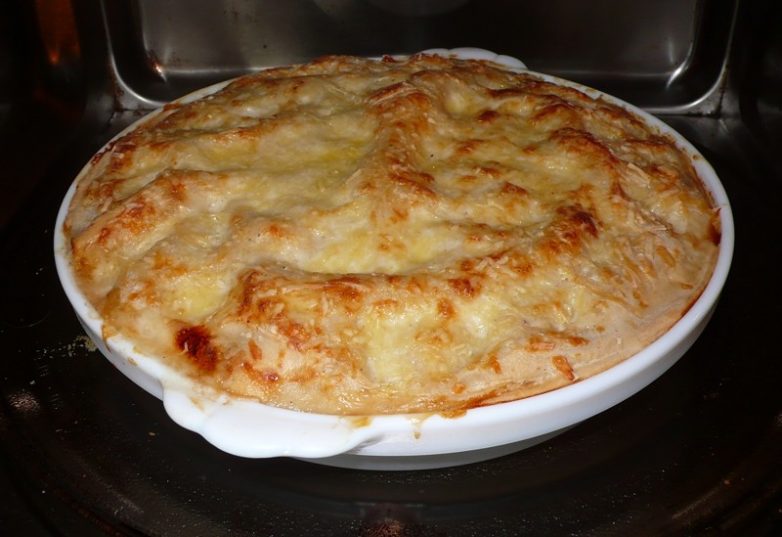 На дно блюда кладем тонким слоем соус бешамель. Сверху слой теста.