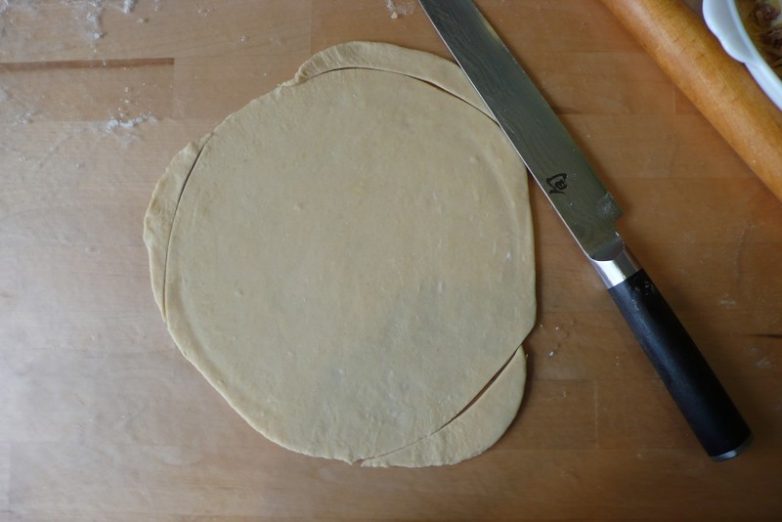 Примеряем к блюду, лишние края можно обрезать. Главное помните, когда вы тесто раскатали и поднесли примерить блюдо, а потом поставили блюдо на место, за это время тесто успевает уменьшиться в размере. И вы можете сильно удивиться, когда начнете класть его в блюдо- оно окажется меньше, чем вы рассчитывали.