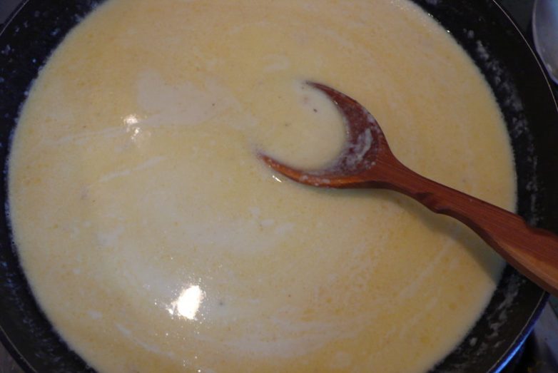 Достаем молоко из холодильника и вливаем в сковороду щедрым жестом без тонких струек. Теперь осталось мешать эту смесь, дать чуть покипеть и выключить как приятно загустеет.